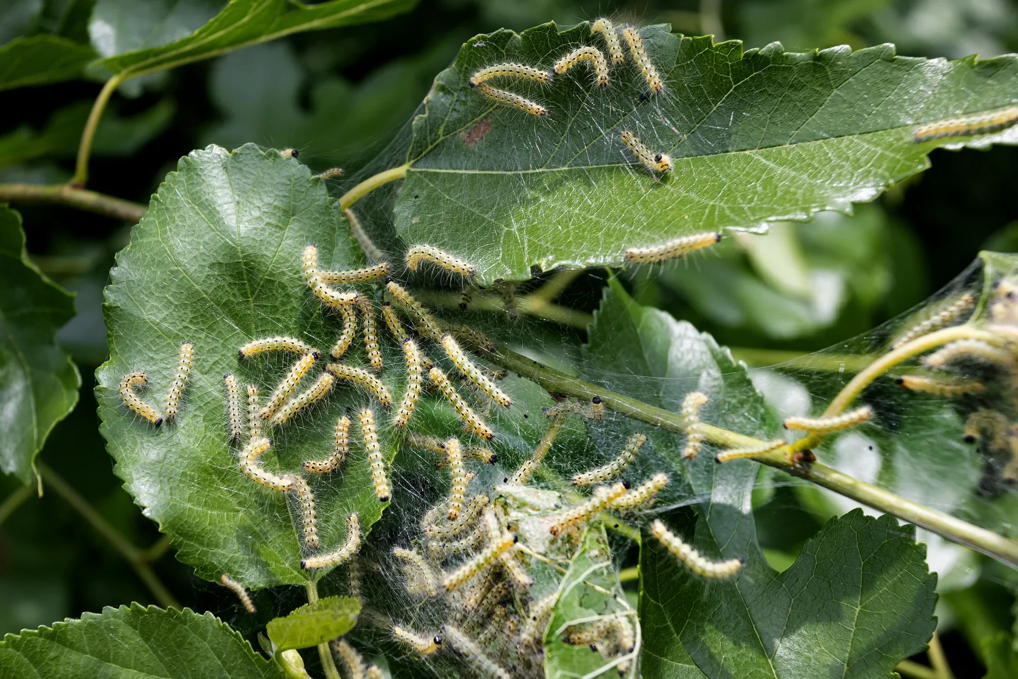 Codling moth caterpillars in silky web on an apple tree branch. Tent silkworm caterpillars in special silk tents land on tree leaves and devour. Selective focus. Agricultural crop pests. Fruit pests