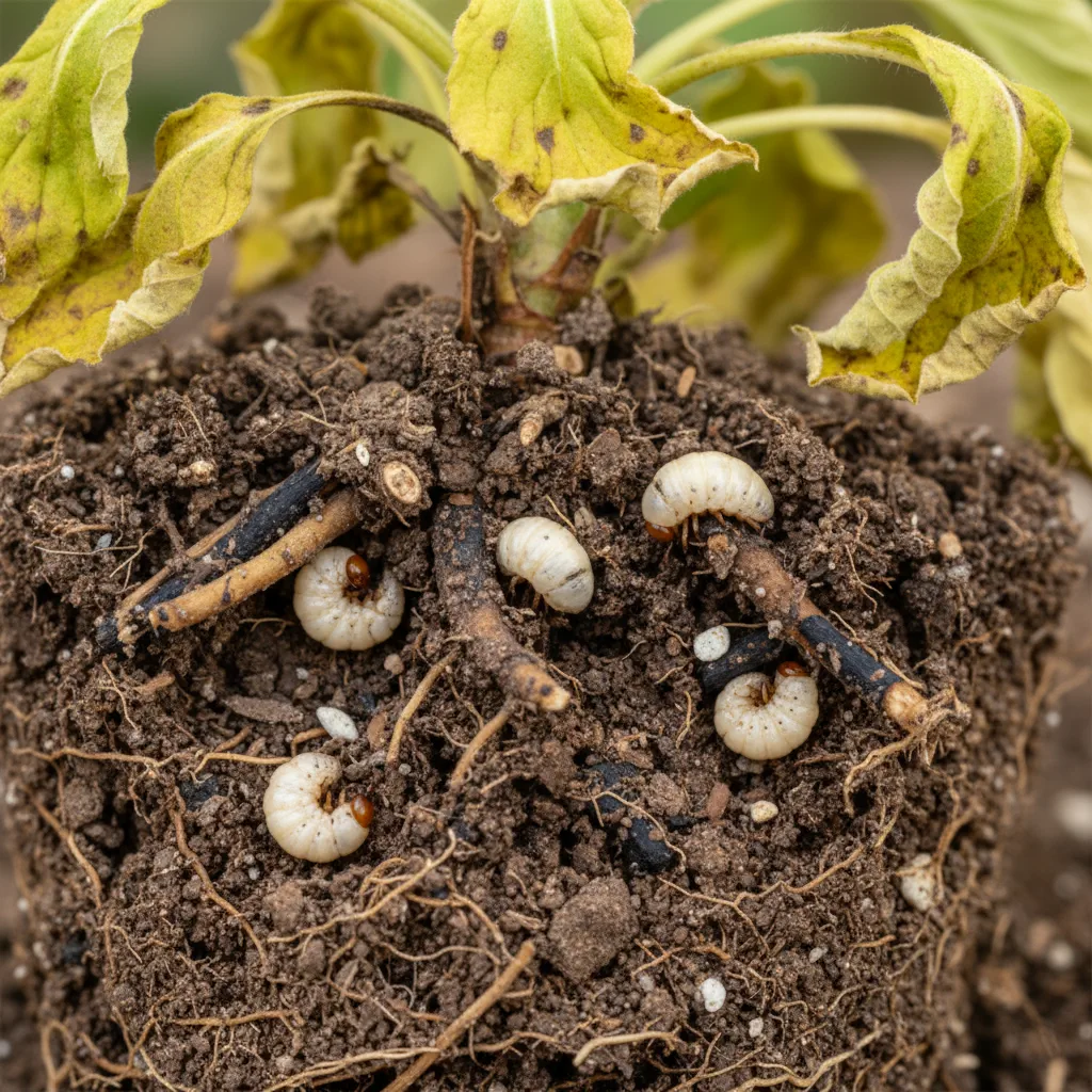 - In extreme cases, an entire plant lifting straight out of the pot with minimal roots attached, accompanied by visible white grubs (the smoking gun!).