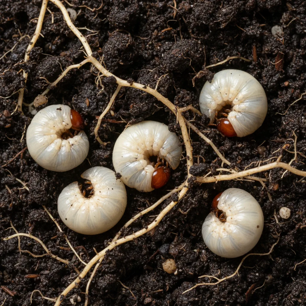 - Unexplained deaths of previously healthy potted plants—removing the rootball may reveal little to no fine roots remaining and numerous crescent-shaped larvae nestled in the compost.