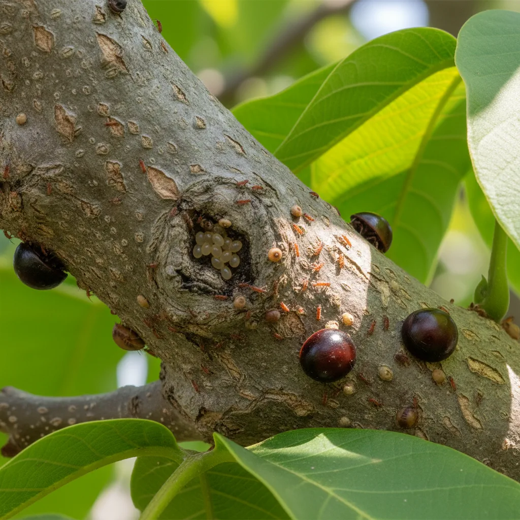 The physical feeding damage also creates a much more lethal secondary threat. The thousands of microscopic entry wounds left by their piercing mouthparts provide the perfect gateway for devastating secondary pathogens. Specifically, they open the door for Botryosphaeria in walnuts, an aggressive fungal pathogen that causes lethal cankers. Once this fungus enters the vascular system, it causes rapid branch dieback and can eventually kill the entire tree. Controlling the insect is the absolute best way to prevent this secondary fungal disease.