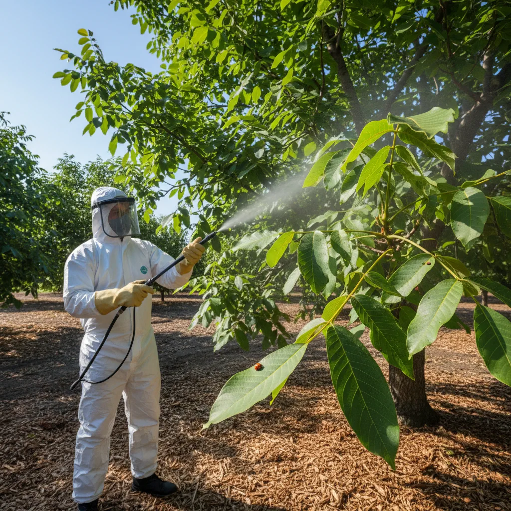 Walnut trees are incredibly sensitive to narrow-range horticultural oils. Applying oils incorrectly can cause severe phytotoxicity, burning the buds and damaging the tree worse than the pest itself. Oils should never be applied during the tree's complete dormancy period. They must also be strictly avoided between bud break and shoot elongation. Never spray oils on trees that are currently water-stressed, and avoid applications entirely when temperatures exceed 32°C (90°F).