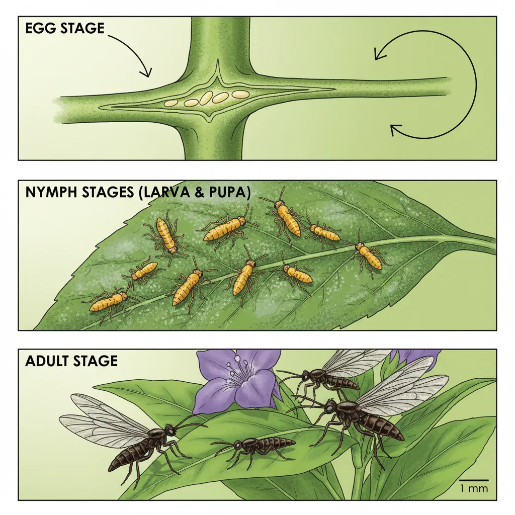 The life cycle begins completely out of sight. An adult female thrips uses her sharp ovipositor to make tiny slits in the soft tissue of leaves, stems, or flower petals. She then tucks her eggs safely inside the plant. Because the eggs sit beneath the plant's surface, they are incredibly difficult to spot and are highly protected from standard pest control sprays. Depending on the temperature of your glasshouse or garden, these eggs will hatch in just a few days to a week.