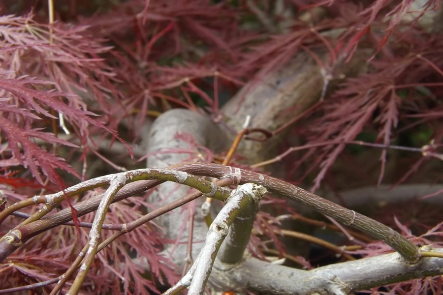 If planted out it can reach a height of a meter and a half with a two meter spread, our Inaba Shidare pictured and featured in the video is still potted and after 30 years it is close to a meter high. The trunk is thick and the main branches go up and then droop horizontally, you can see in the image "Crown Branch" how strong it is. It has to hold all the smaller branches which cascade down. The smaller branches are thin and twiggy and hold a large network of leaves, the leaves are delicate and seem to weigh nothing, but just by the amount of number of leaves they pull the branches down, giving the cascading effect.